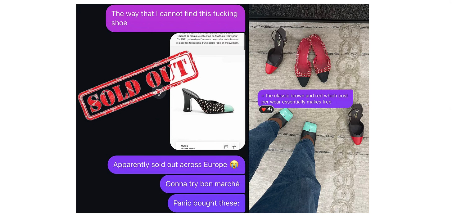 On the other side of things there is Gabriella Karefa-Johnson and her group chat collectively obsessesing over Chanel hitting Paris stores. Do I too, need a pair of Chanels for this summer? Their excitement got to me. She wrote about it on her Substack- she adds meaning to her obsession through words and more complex thoughts than a lazy Instagram story. Brain matter made Chanel matter. Even more.