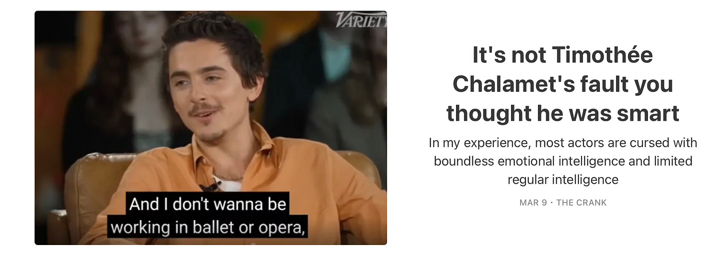 People were obsessed with Timothée Chalamet until his heinous comment on the arts of ballet and opera in an interview a few weeks back. Now everyone is obsessed with hating on Timothée Chalamet. I just read The Crank newsletter “It’s not Timothée Chalamet’s fault you thought he was smart” and so should you. I was obsessed with him for 130 minutes, seven years ago in “Call me by your name”. The spark was soon gone watching an interview with him being himself, he’s just a boy ugh. Obsessions can be unstable constructs especially if build on individuals. The Swifties are so obsessed with Taylor Swift they came up with a name to be identified for their obsession. I just hope Taylor will forever hold it all together or we will have millions of ten year olds crying over their lost obsession.